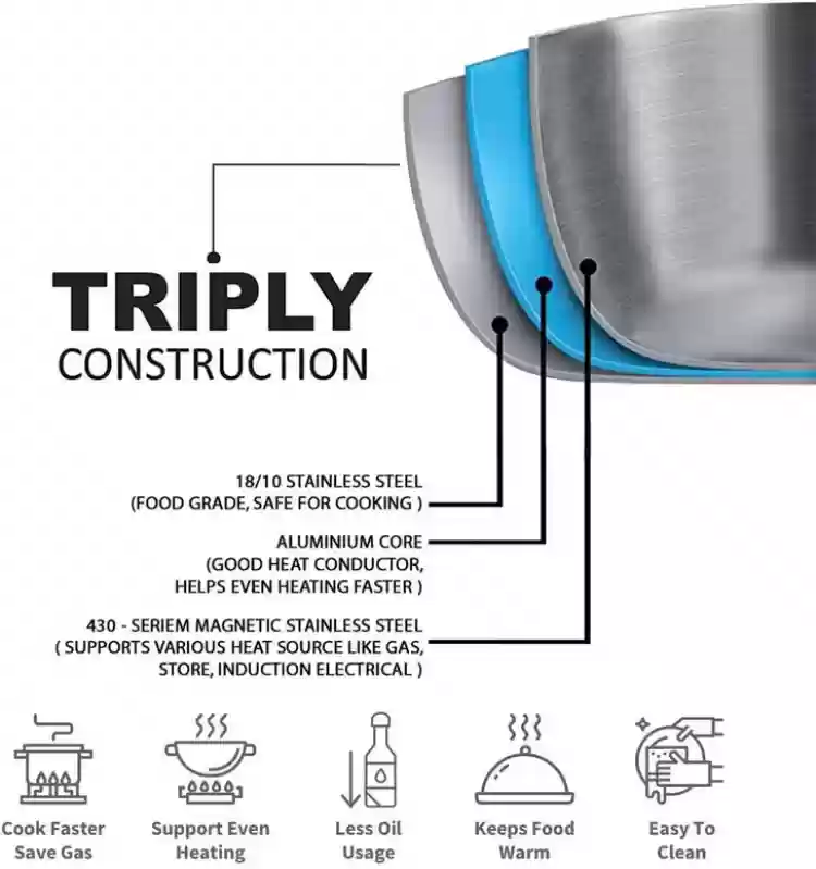 • TRIPLY: Made of high-quality triply material. 0% Contact with Aluminum.