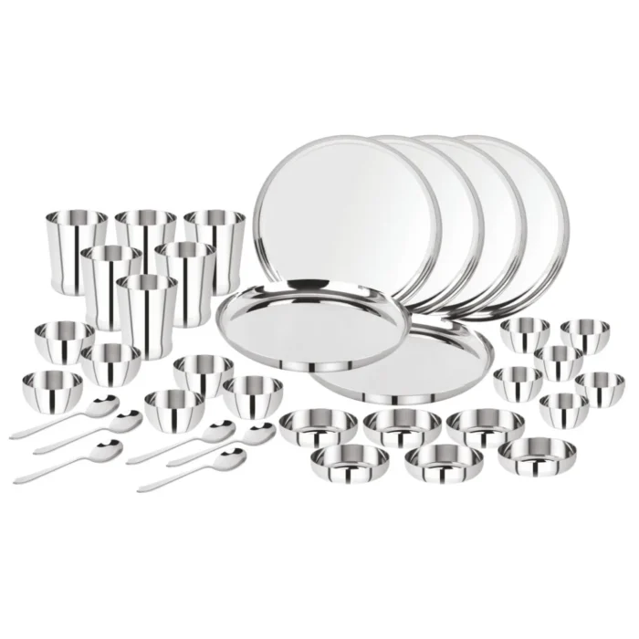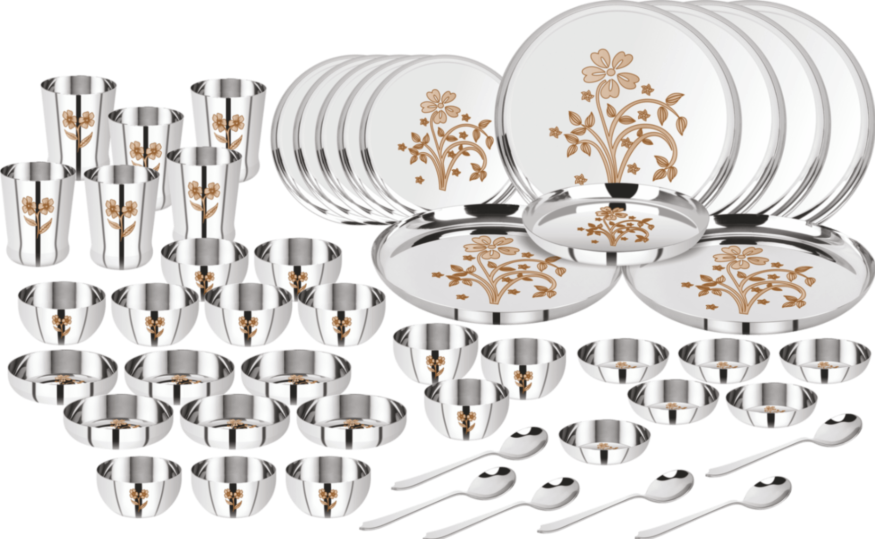The set contains 6 plates, 6 quarter plates, 6 sweet plate, 6 vegetable bowl, 6 dal bowl, 6 chutney plate, 6 spoons and 6 glasses.