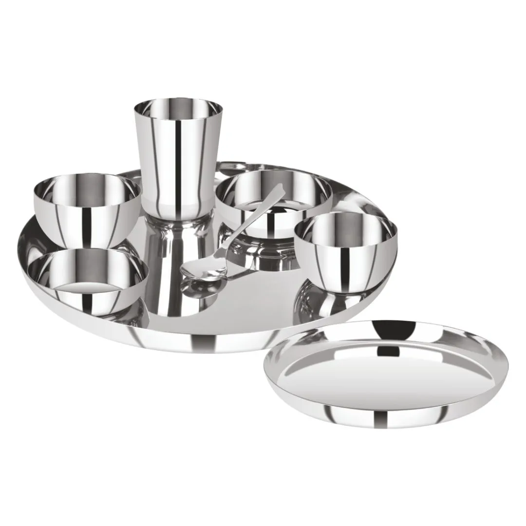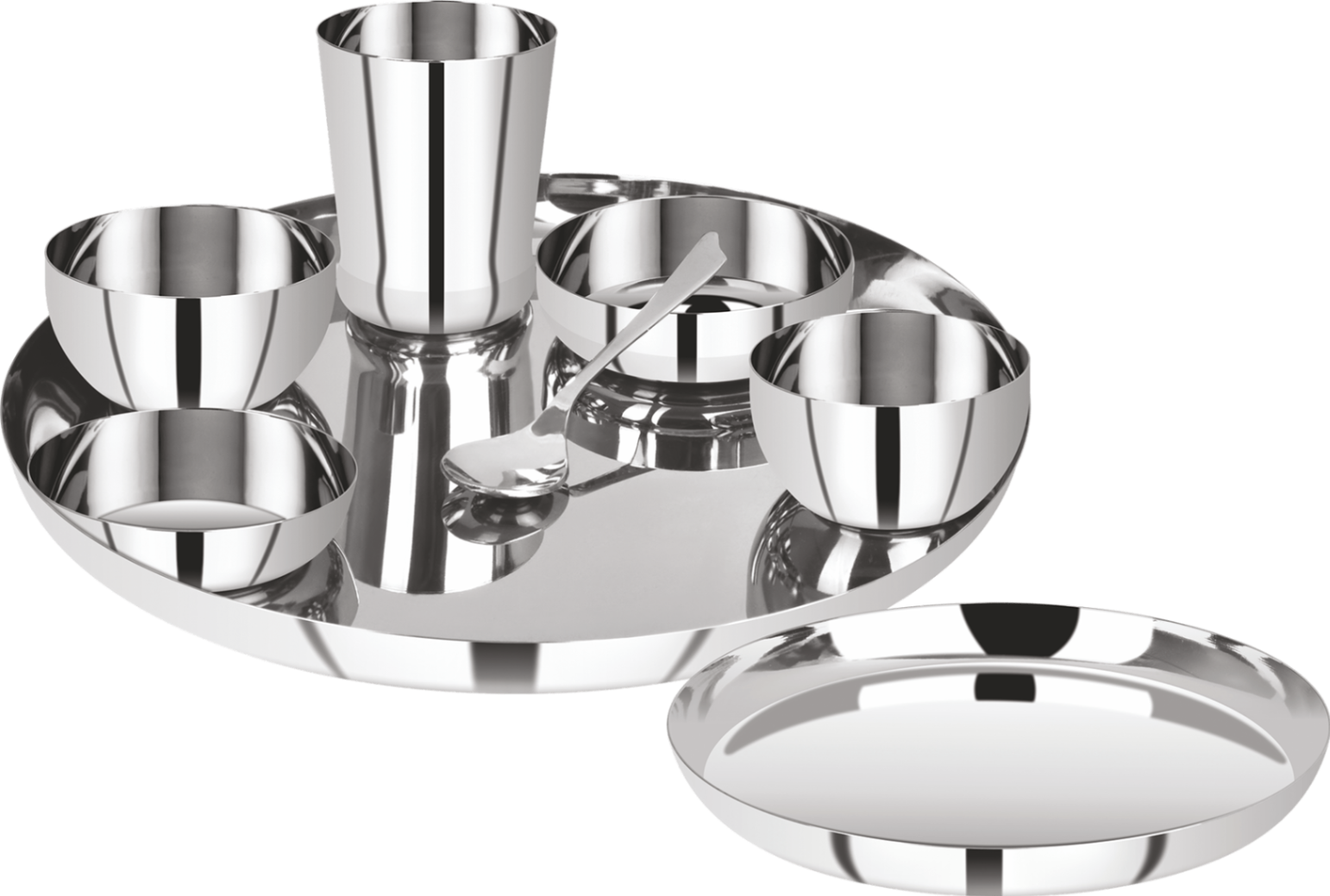 Rajbhog set, a need in every household, it has all the required utensils to set up your table for people to eat. It is durable, dependable and economical for home use and can even be used for gifting purpose. Made with high quality stainless steel the dinner set is safe and hygienic. It is unbreakable, easy to clean and maintain, trendy and modern design. It doesn’t retain any stain, odor or flavor’s and suitable to serve each type of cuisine. It is perfect for your family to eat in style or impress your guests with this all-in-one Rajbhog Set. It is even perfect for gifting to your friends or family.