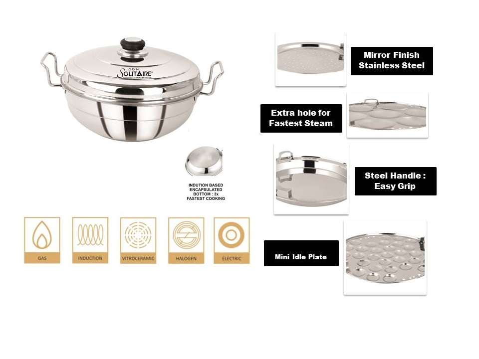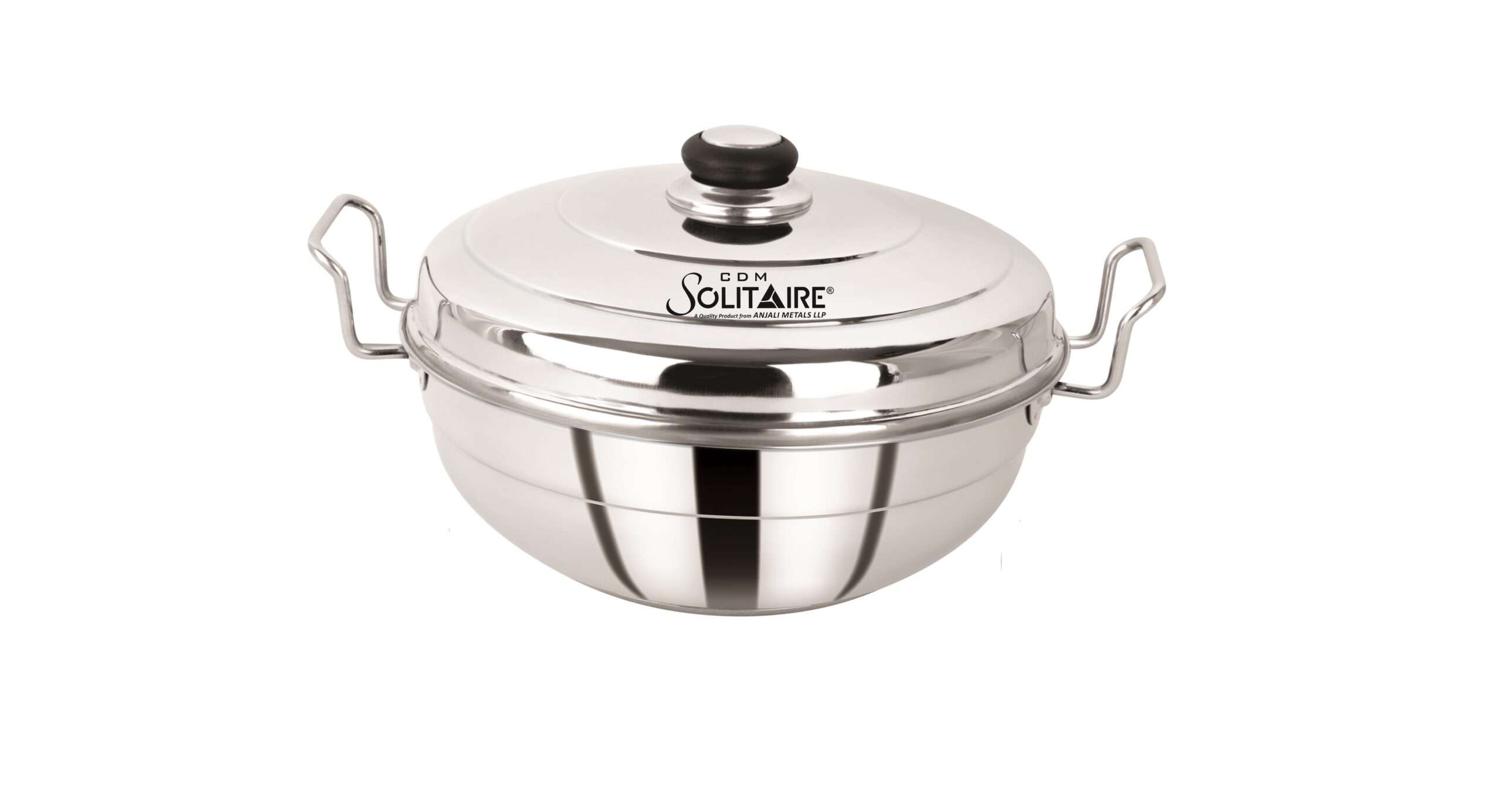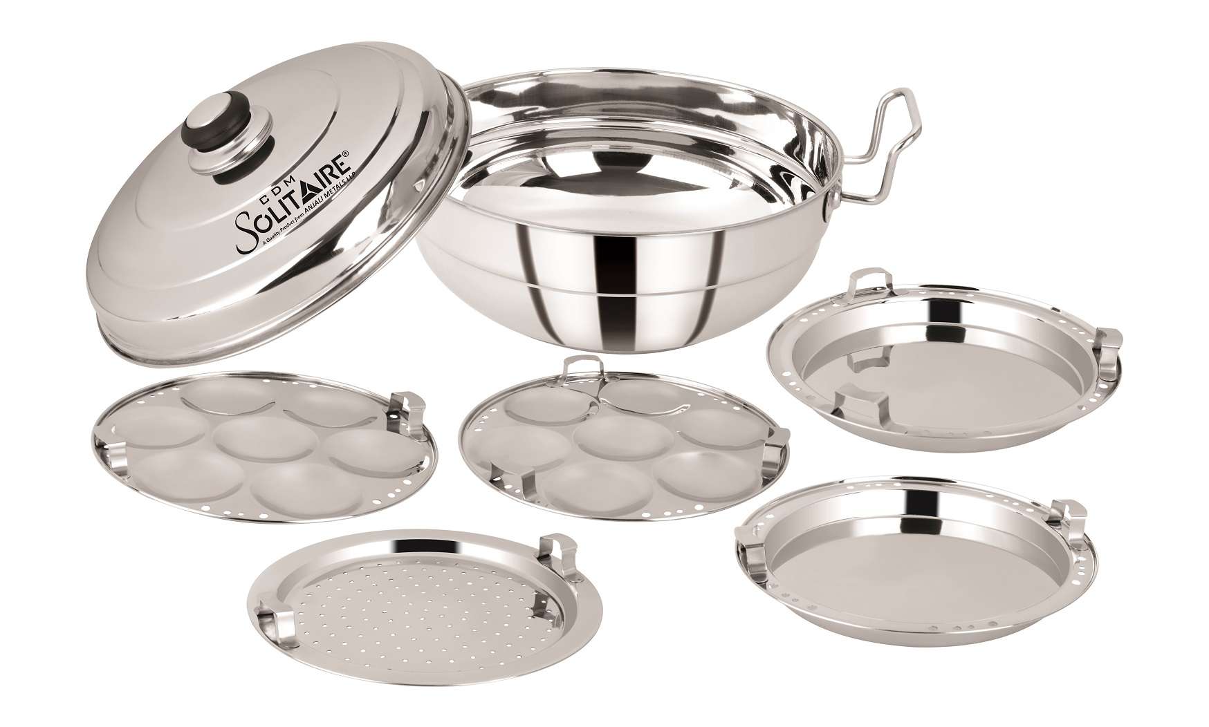 CDM Solitaire Stainless Steel Idli Cooker Multipurpose Kadai 8-In-1Idli And Dhokla Steamer|1 Mini Idli | 2 Idli Plate | 1 Patra | 2 Dhokla Multi Utility Kadai